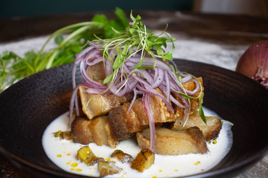 CRISPY SKIN ON PORK BELLY WITH THE OPTION OF TIGER’S MILK AND PERUVIAN SARZA