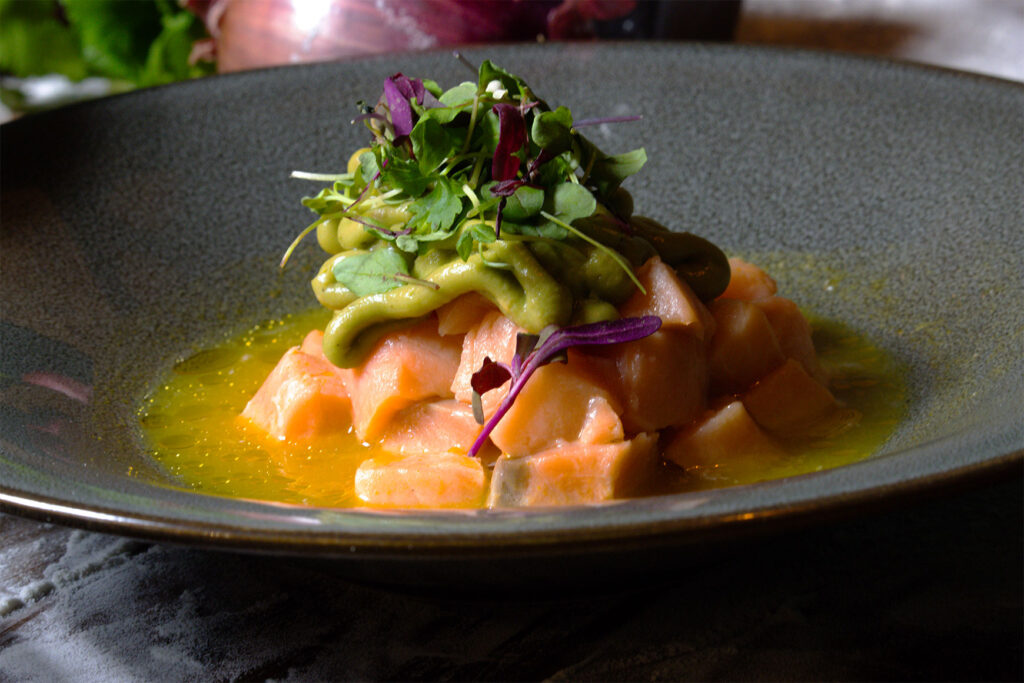 SALMON, CANCHA CORN POWDER, PASSION FRUIT TIGER’S MILK, AVOCADO CREAM, PICKLED RED ONION AND MORITA CHILI OIL
